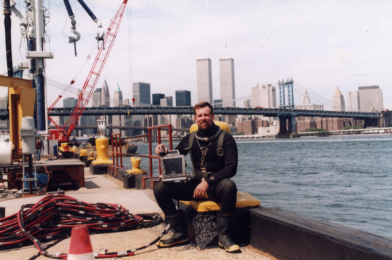I was working as the diving supervisor on a job under the World Financial Center, across West St. from the World Trade Center. When they built the World Trade Center, instead of trucking the fill from the excavation to Jersey, they used it to make more Manhattan. Back in the 70’s when they built Battery Park City they used the fill from the WTC excavations. However, they left a 200′ wide clear path above each PATH tunnel. All of the fill was contained with heavy timber bulkheads, with pilings supporting the building overhead.